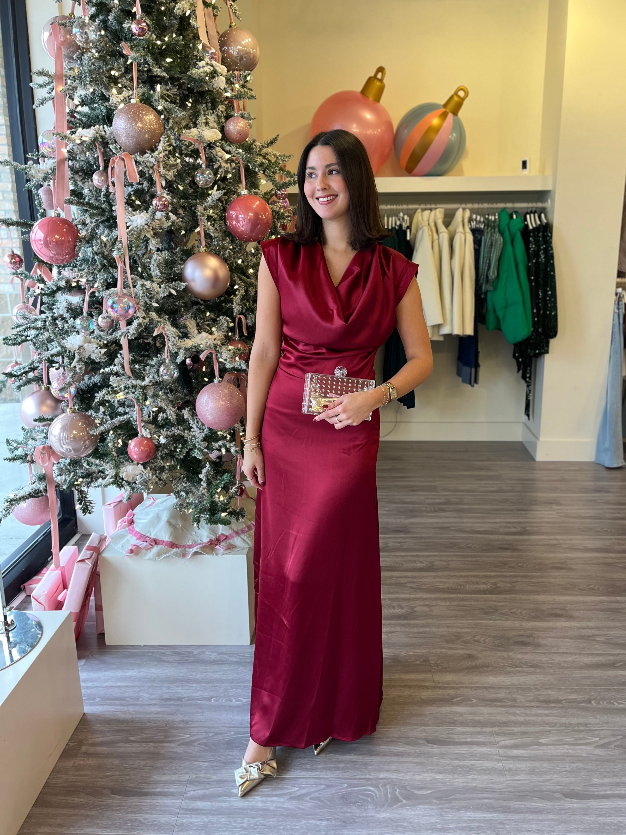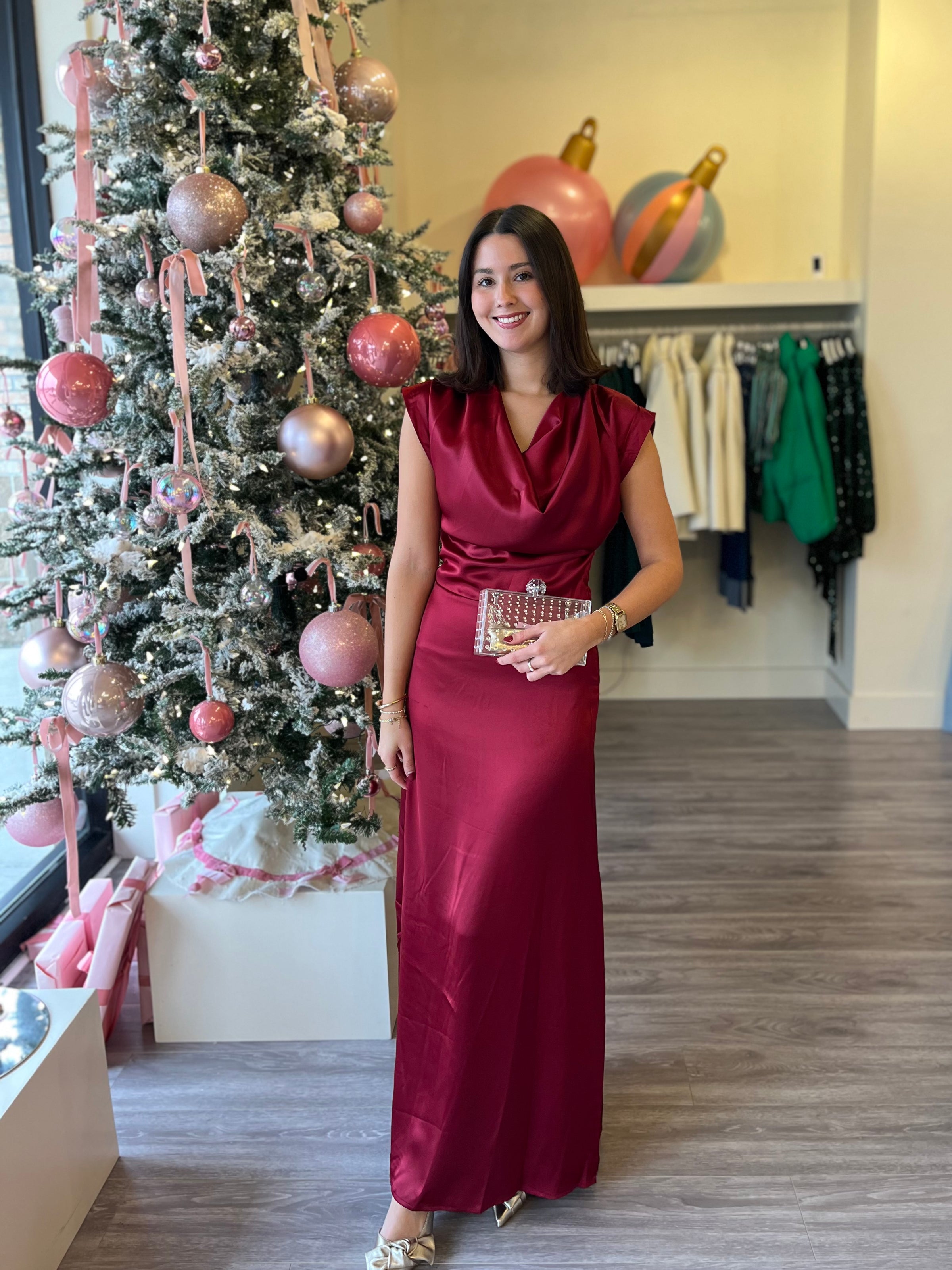DE8974 Wine Cowl Neck Satin Maxi