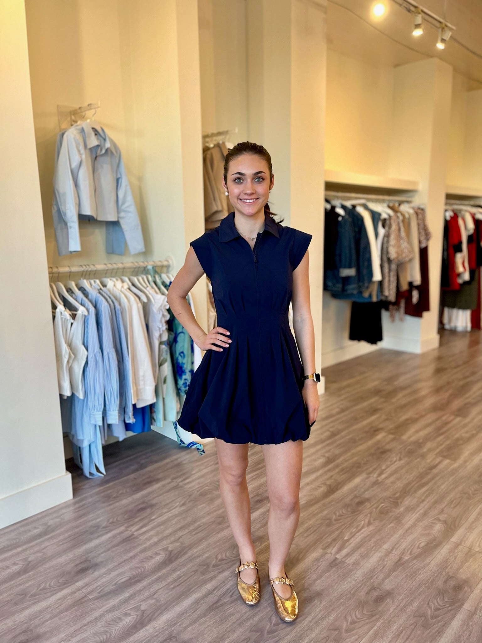 BB8971 Navy Collared Zip-Up Bubble Mini Dress