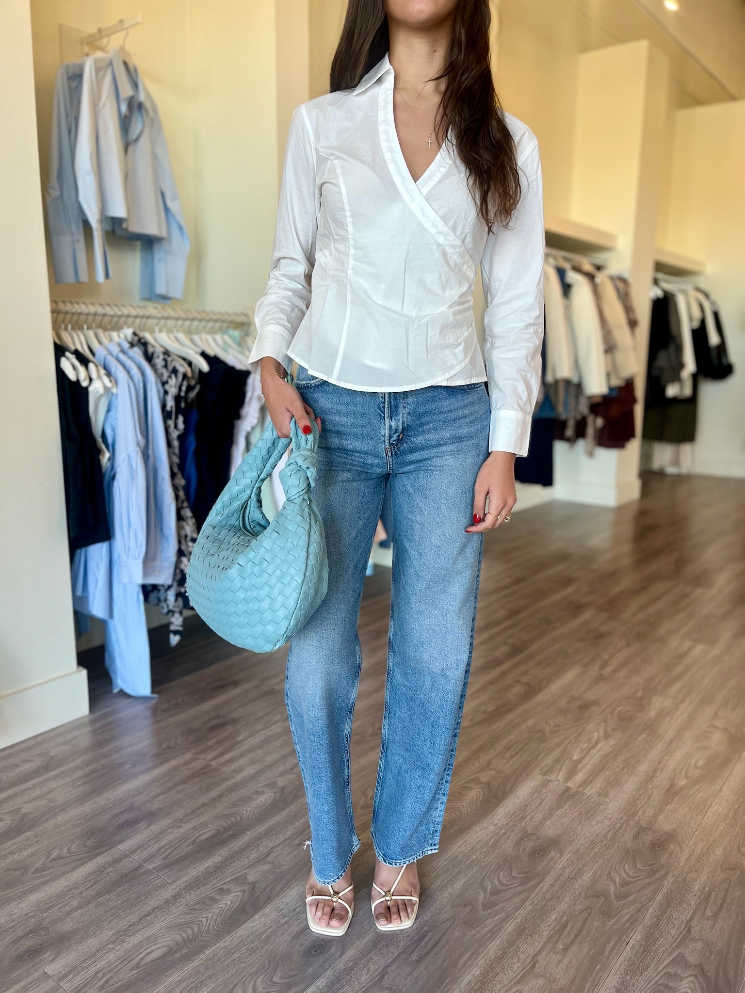HL07B White Longslv Wrap Top w/ Buttons
