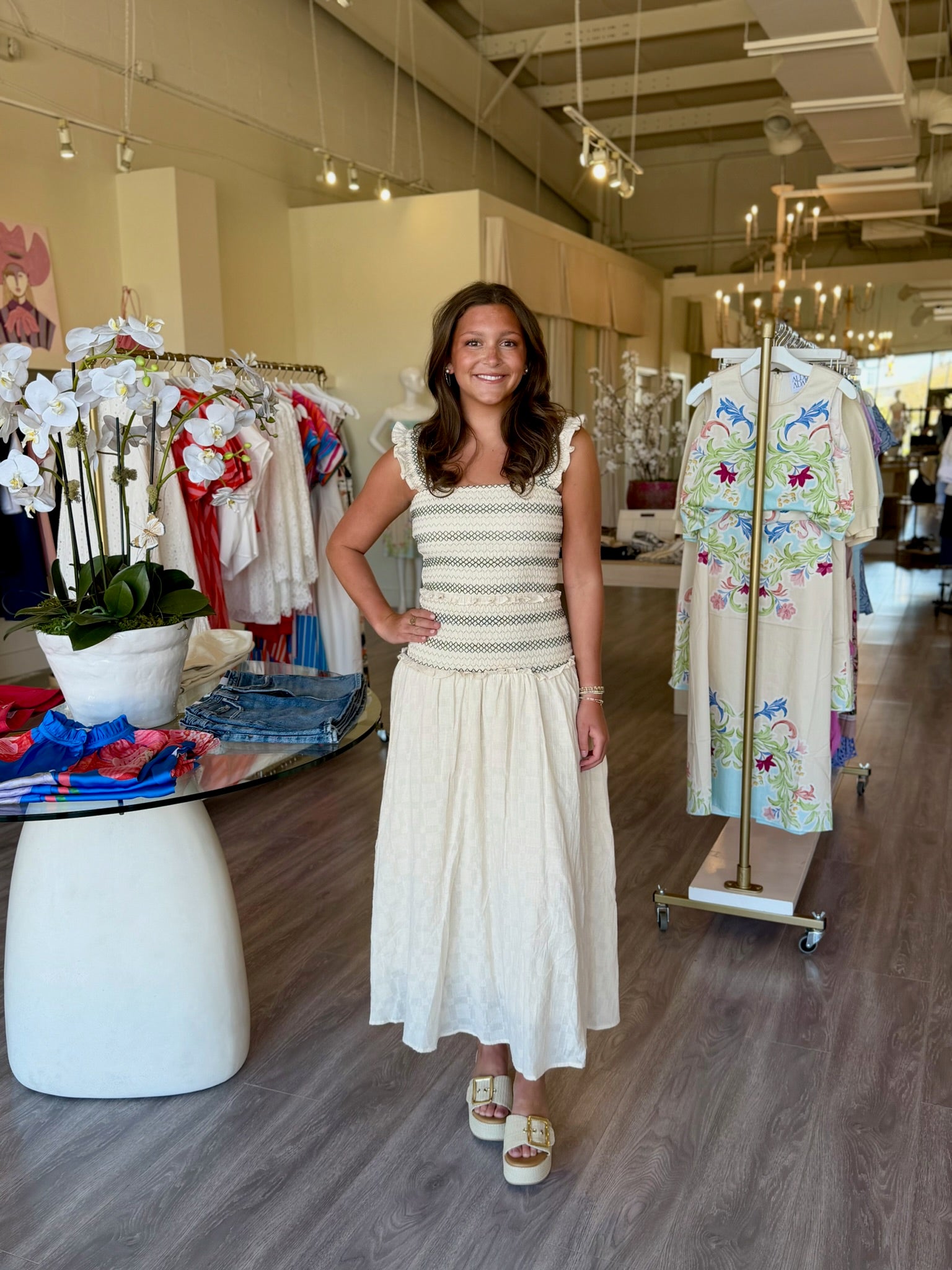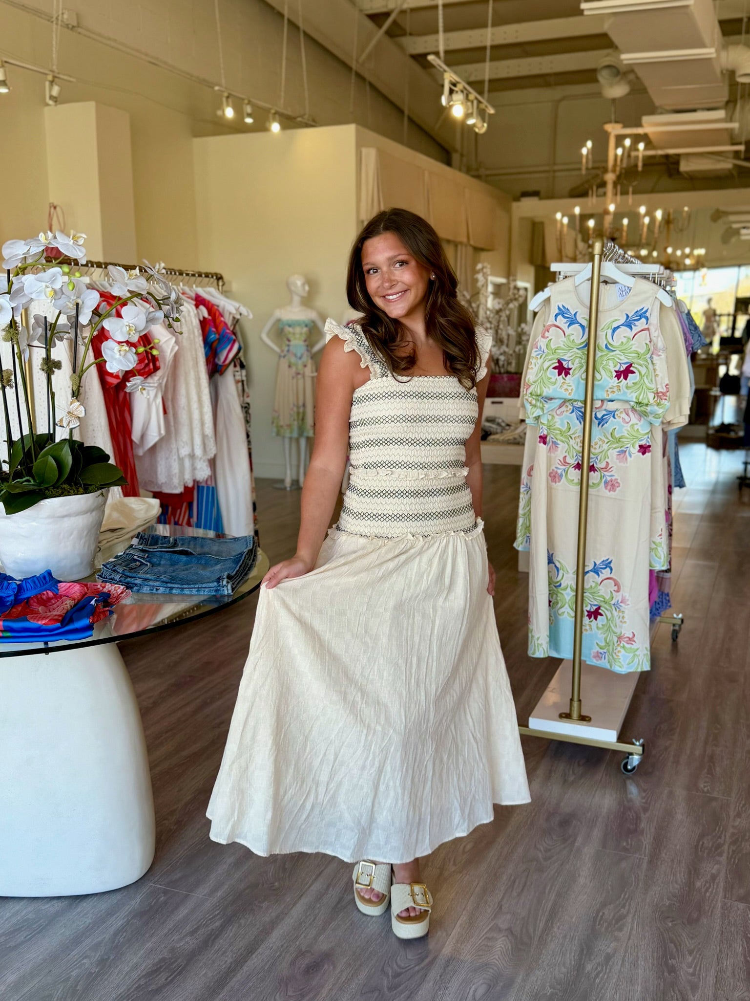 HLY8A Smocked Beige Midi w/ Black Stripe Details