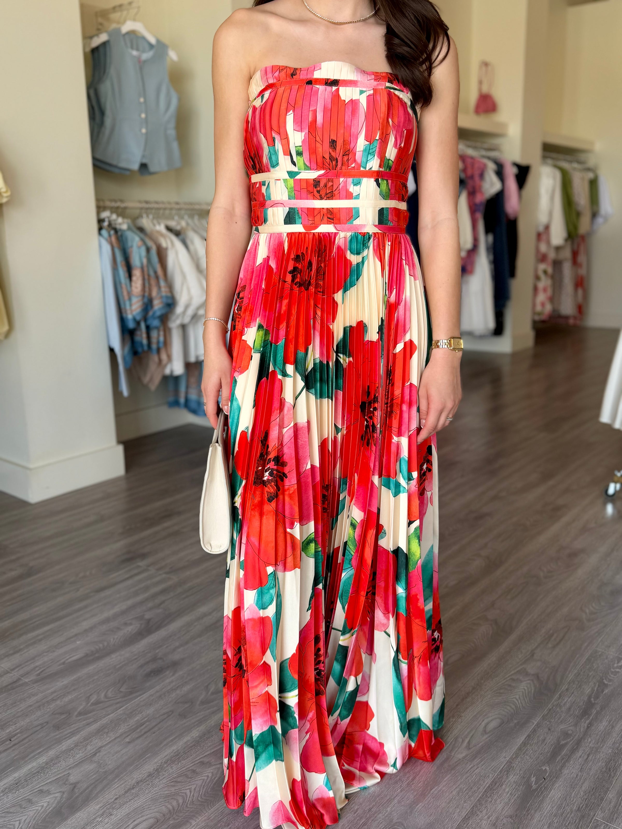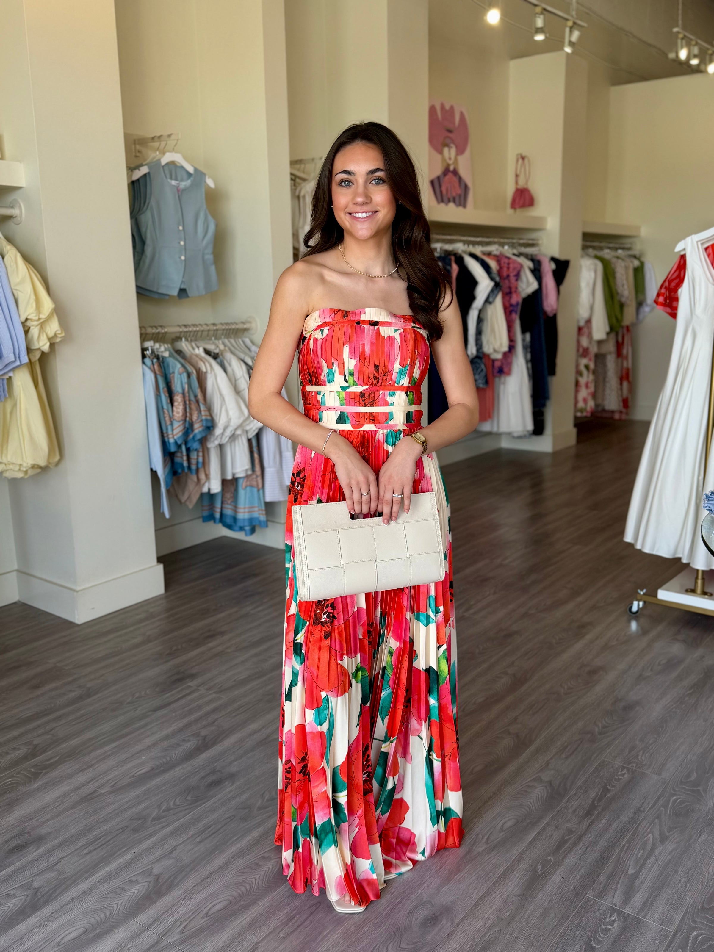 HU1068 Strapless Ivory/Coral Floral Print Maxi