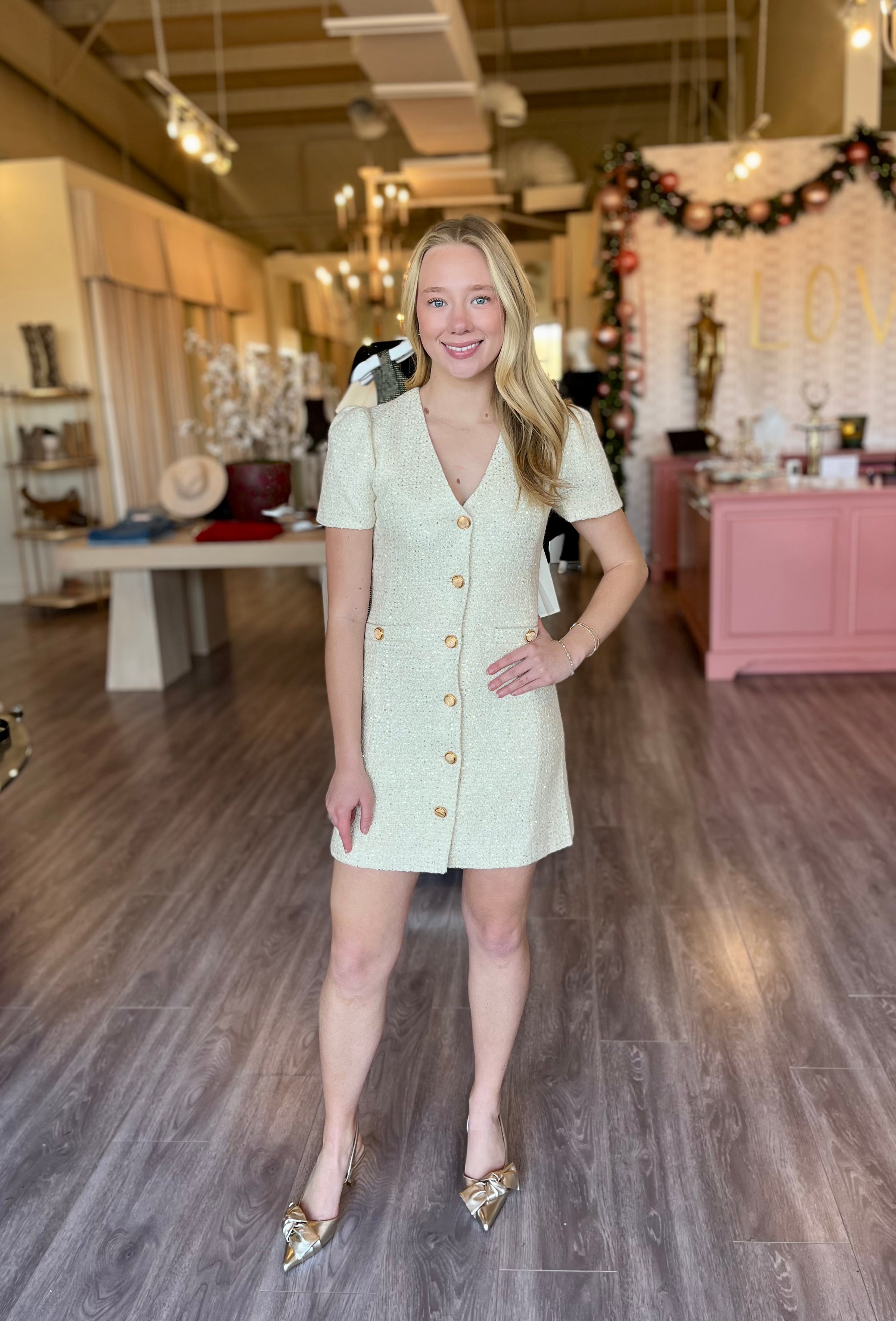 LA8005 Cream Tweed Mini Dress w/ Button Details